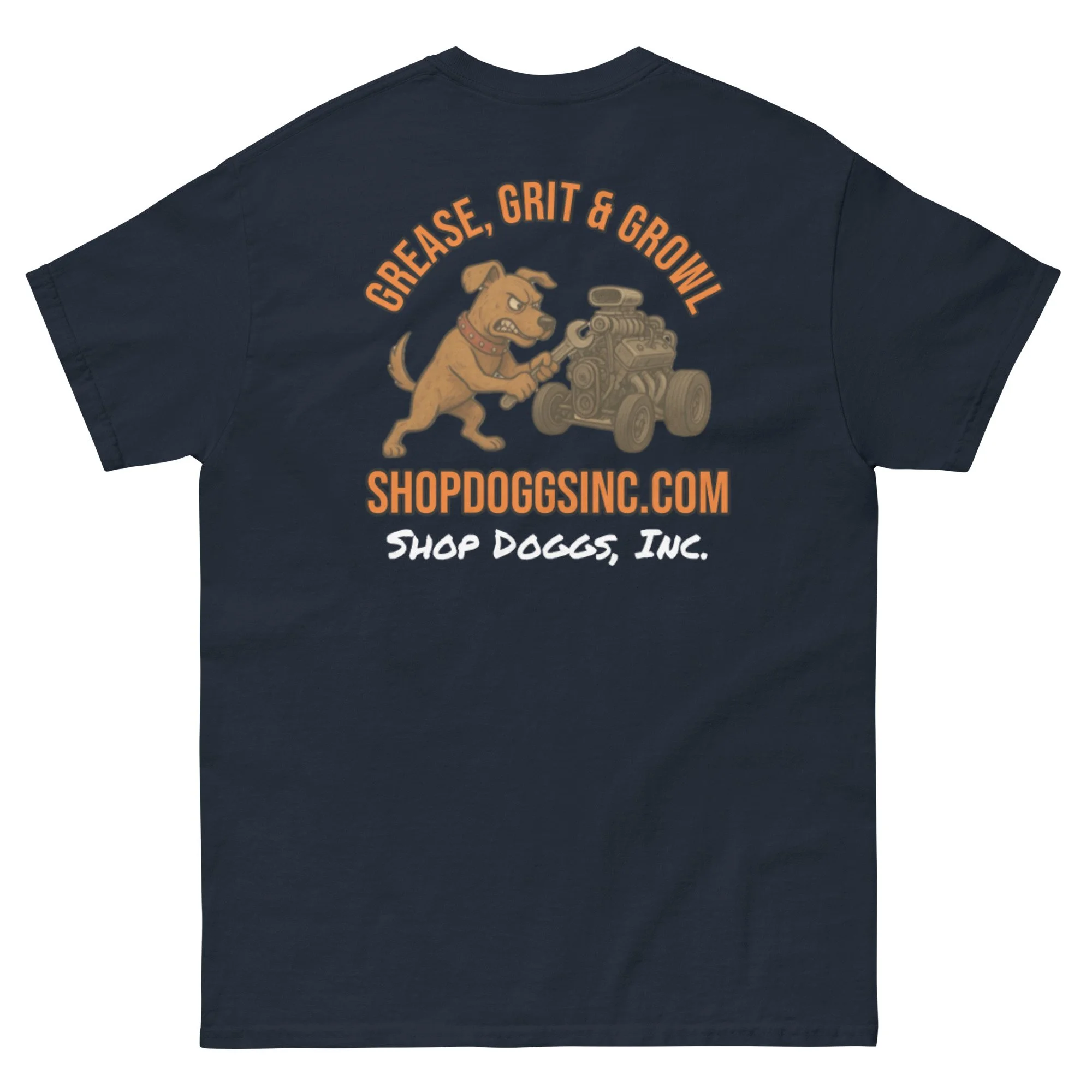 The “Grease Grit & Growl” tee is built for the garage warriors. This design captures our Dawg muscling an engine —no hoist, no help, just raw determination. It’s the perfect shirt for the wrencher who’s not afraid to get dirty and put in the grind. Wear it at the shop, the track, or anywhere you want to rep the grease-stained spirit of Shop Doggs.